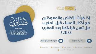 احسن الله اليكم. يقول السائل اذا قرأت المعوذات والاخلاص ثلاث مرات قبل المغرب مع اذكار المساء هل يسن قراءتها ثلاثا بعد المغرب كذلك ام مرة واحدة تقصف مغفرتك لها قبل المغرب - 00:00:01ضَ