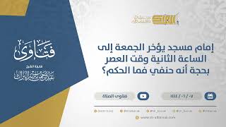 احسن الله اليكم. يقول السائل عبر الشبكة امام مسجد اه جيد لكنه يصلي الجمعة الساعة الثانية وهي توقيت العصر ويقول انا على المذهب الحنفي والاحناف يؤخرون العصر اه فما حكم الصلاة معه؟ علما بان بقية المساجد - 00:00:00ضَ