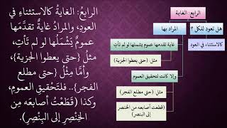الرابع الغاية كالاستسناء في العود والمراد غاية تقدمها عموم يشملها لو لم تأتي مثل حتى يعطوا الجزية واما مثل حتى مطلع الفجر فلتحقيق العموم وكذا قطعت اصابعه من من الخنص - 00:00:00ضَ