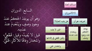 السابع الدوران وهو ان يوجد الحكم عند وجود وصف وينعدم عند عدمه. هذا المسلك السابع وهو الدوران ويسمى ايضا الطرد والعكس الدوران معناه ان يثبت الحكم بوجود الوصف وينتفي بانتفائه - 00:00:01ضَ