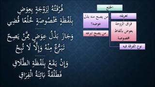 بعوض بلفظة مخصوصة خل عنقضي وجاز بذل عوض ممن يصح تبرع من هو الا لا تبح وان يقع بلفظة الطلاق فطلقة بائنة الفراق. يتكلم الناظم في هذا الدرس عن ايش؟ عن الخلع. الخلع نبدأ اولا بتعريفه. ما تعريف الخلع؟ فان الحكم على الشيء فرع عن تصوره. تعريف الخلع هو فراق الزوجة بعوض بالفاظ مخصوصة - 00:00:20ضَ