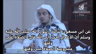 فهذا ظاهر. نعم. طيب حديث ابن مسعود اللي هو فقرة تسعة واربعين. قال سألت رسول الله صلى الله عليه وسلم اي الاعمال احب الى الله عز وجل؟ قال الصلاة على وقتها. يدل على مشروعية الصلاة على وقتها. نص نعم - 00:08:30ضَ