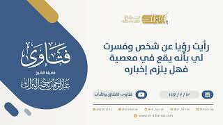 احسن الله اليكم يقول السائل اذا رأيت رؤيا عن شخص وفسرتها عند معبر وفيها تحذير للشخص في وقوعه في معصية فهل يجب علي اخباره عنها مساء الخير اذا كان ركع عليه طريق ناصح ومناصحة عن عن الوقوع في هذه المعصية - 00:00:00ضَ