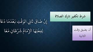 آآ يقيد عند الحنابلة بقيدين. ذكرتهما في هذا البيت وهو قولي ان ضاق ثاني الوقت بعدما دعا لفعلها بفعلها الامام شرطان معا. اذا شرطان لتكفير تارك الصلاة. الشرط الاول ان يضيق ثاني الوقت - 00:00:39ضَ
