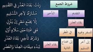 اه اربع خمسة ابيات يعني هنا خمسة ابيات في باب القصر والجمع وهذه الابيات الخمسة هي في بيان شروط الجمع فان الناظم وفقه الله ونفع بعلومه ذكر شروط الجمع وذكر شروط جمع التقديم - 00:00:17ضَ