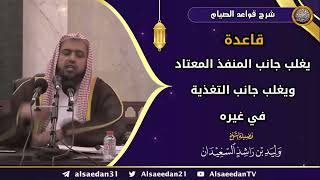 قاعدة يغلب جانب المنفذ المعتاد ويغلب جانب التغذية في غيره. يغلب جانب المنفذ المعتاد ويغلب جانب التغذية في غيره. وهذه اوسع القواعد تفريعا. وعليها يدور باب الصوم. عليها باب الصبح وهي قاعدة يغلب جانب المنفذ المعتاد ويغلب جانب التغذية في غيره. وشرحها ان نقول - 00:00:00ضَ