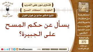 جزاكم الله خيرا واحسن اليكم. ايضا يسأل عن حكم المسح على الجبيرة. المسح على الجبيرة ايضا فيه رخصة للمجروح عنه فاذا كانت الجبيرة على قدر الجرح او كان اللصوق على قدر الجراحة او الظماد وكان في احد اعضاء الوضوء فانه - 00:00:00ضَ
