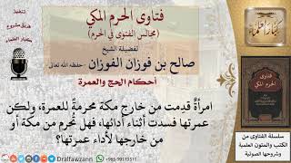 وهذا سائل يقول امرأة قدمت من خارج مكة محرمة للعمرة ولكن عمرتها فسدت اثناء ادائها. فهل تحرم من مكة او من خارجها لاداء عمرة كيف فسدت ما ندري وش فسدت - 00:00:01ضَ