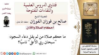 ما حكم صلاة من لم يقل دعاء السجود سبحان ربي الاعلى ناسيا واذا ترك واجبا من واجبات الصلاة فعليه ان يأتي بركعة بدل ما ترى اذا كان تركه في السجود - 00:00:00ضَ
