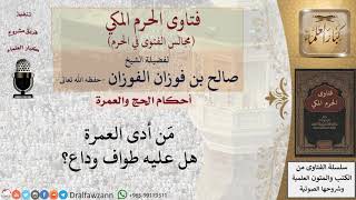 من ادى العمرة هل عليه طواف وداع لا يلزمه طواف الوداع في العمرة لان الوداع انما يلزم في الحج قال صلى الله عليه وسلم لا ينفرن احد حتى يكون اخر عهده بالبيت. هذا قاله في الحج - 00:00:00ضَ