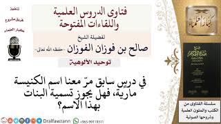 في الدرس السابق مر معنا اسم الكنيسة ماريا هل يجوز تسمية البنات بهذا الاسم؟ لا ما تسمى باسم كنائس النصارى. نعم فضيلة الشيخ يقول السائل لكن مريم تسمى بها لان مريم صديقة ام المسيح عليه الصلاة والسلام وهي مؤمنة وصديقة - 00:00:00ضَ