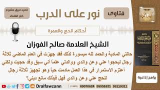 حالة المادية والحمد لله ميسورة ولذلك فقد جهزت في العام الماضي ثلاثة رجال ليحجوا عني وعن والدي ووالدتي علما انني سبق وان حجيت ولكني اعتزل الاستمرار في هذا العمل ما دمت حيا وهو تجهيز ثلاثة رجال للحج عني وعن والدي. فهل - 00:00:00ضَ