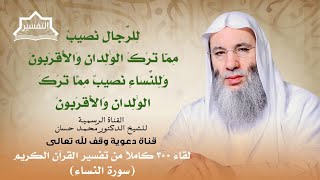 للرجال نصب ما ترك الوالدان والاقربون. الوالدان هما الاب والام وقال جل وعلا والاقربون ولم يقل والاقارب ليه لان الميراث لا يشمل جميع الاقارب بل الاقرب في الاقرب لقول النبي صلى الله عليه وسلم - 00:15:18ضَ