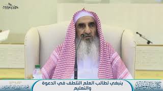 وهذا الذي ينبغي يا اخوان من طالب العلم في تعليمه وفي دعوته ان اكون متلطفا بمن يعلم يكون قاسيا صلبا حنيفا منفرا فبابي هو وامي يقول معاوية بن الحكم والله ما رأيت معلما قبله ولا بعده - 00:00:00ضَ
