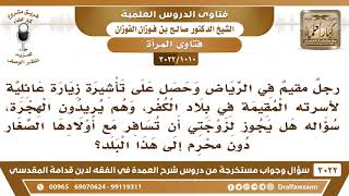 فضيلة الشيخ وفقكم الله يقول رجل مقيم في الرياض وحصل على تأشيرة زيارة عائلية لاسرته المقيمة في بلاد الكفر. وهم يريدون الهجرة. سؤاله هل يجوز لزوجتي ان تسافر ومع اولادها الصغار دون محرم الى هذا البلد؟ لا - 00:00:00ضَ