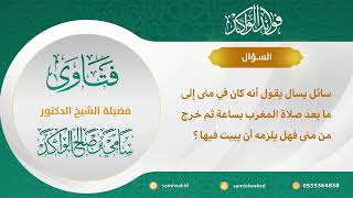 سائل يسأل يقول انه كان في منى الى ما بعد صلاة المغرب بساعة ثم خرج من منى فهل يلزمه ان يبيت فيها؟ الجواب الحمد لله المبيت بمنى ينقسم الى اقسام. القسم الاول - 00:00:00ضَ