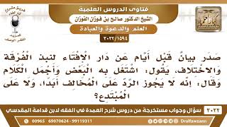 فضيلة الشيخ وفقكم الله. يقول السائل صدر بيان قبل ايام عن دار الافتاء لنبذ الفرقة والاختلاف. نعم. يقول اشتغل به البعض واجمل الكلام وقال انه لا يجوز الرد على المخالف ابدا ولا على المبتدع. ما في البيان هذا ما في البيان انه ما يرد على - 00:00:00ضَ