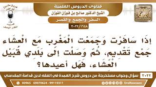 فضيلة الشيخ وفقكم الله يقول اذا سافرت وجمعت المغرب مع العشاء جمع تقديم ثم وصلت الى بلدي قبيل العشاء. فهل اعيدها؟ لا. صليت وهو يجوز لك الجمع. جمعت وهو يجوز لك الجمع لانك - 00:00:00ضَ