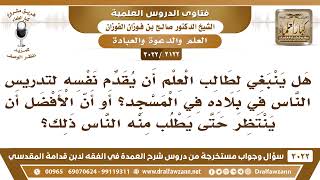 فضيلة الشيخ وفقكم الله يقول هل ينبغي لطالب العلم ان يقدم نفسه لتدريس الناس في بلاده في المسجد او ان الافظل ان ينتظر حتى يطلب منه الناس ذلك. اذا كان عنده استعداد - 00:00:00ضَ