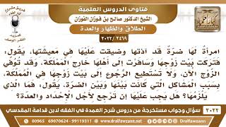 فتركت بيت زوجها وسافرت الى اهلها خارج المملكة وقد توفي الزوج الان ولا تستطيع الرجوع الى بيت زوجها في المملكة بسبب المشاكل التي كانت بينها وبين الضرة. يقول فما الذي يلزمها؟ هل يجب عليها ان ترجع لاجل احداث والعدة - 00:00:26ضَ