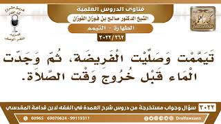 فضيلة الشيخ وفقكم الله تيممت وصليت الفريظة. ثم وجدت الماء قبل خروج وقت الصلاة. لا يا اخي ما دام صليت ما عندك ماء وصليت؟ صلاتك صحيحة. لانك بنيتها على طهارة شرعية. نعم - 00:00:00ضَ