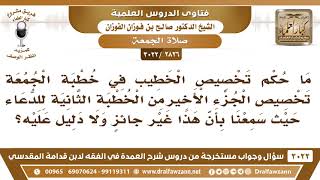 فضيلة الشيخ وفقكم الله يقول السائل يقول ما حكم تخصيص الخطيب لخطبة الجمعة؟ تخصيص الجزء الاخير من الخطبة الثانية للدعاء. حيث سمعنا بان هذا غير جائز ولا دليل عليه. من هو اللي يقول غير جائز ولا دليل عليه - 00:00:00ضَ