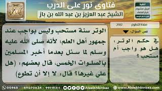 قل في حكم الوتر هل هو واجب ام مستحب؟ الوتر سنة مستحب وليس بواجب عند جمهور اهل العلم لانه الرسول صلى الله عليه وسلم لما سئل بعد ما اخبر المسلمين بالصلوات الخمس قال بعضهم هل هل علي غيرها؟ قال الا ان تطوع. فالوتر - 00:00:00ضَ