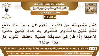 يقول فضيلة الشيخ وفقكم الله نحن مجموعة من الشباب يقوم كل واحد منا بدفع مبلغ معين بالتساوي لنشتري به كتابا يكون جائزة لاحدنا اذا فاز في مسابقة علمية لحفظ المتون. هل هذا جائز - 00:00:00ضَ