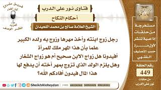 رجل زوج ابنته واخذ مهرها. وزوج به ولده الكبير علما بان هذا المهر ملك للمرأة. افيدونا هل زواج الابن صحيح ام هو زواج الصغار؟ وهل يلزم الولد الذي تزوج بمهر اخته ان يدفع لها هذا المال؟ افيدونا افادكم الله - 00:00:00ضَ