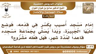 فضيلة الشيخ وفقكم الله امام مسجد اصيب بكسر في قدمه فوضع عليها الجبيرة وبدأ يصلي بجماعة مسجده قاعدا لمدة شهر. قاعدا؟ نعم. ايه. نعم. لمدة شهر فهل فعله مشروع نعم امام المسجد الراتب - 00:00:00ضَ