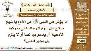 ما يؤثر عن النبي صلى الله عليه وسلم من الادعية شيخ صالح هل يلزم المرء الداعي بتلكم الادعية ان يدعو بها نصا او لا يلزم بل يجوز المعنى الافضل الله المستعان. ليحفظ - 00:00:00ضَ