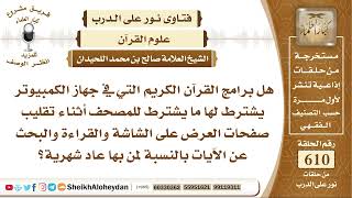 احسن الله اليكم هل برامج القرآن الكريم التي في جهاز الكمبيوتر يشترط لها ما يشترط للمصحف اثناء تقليب صفحات العرض على الشاشة والقراءة والبحث عن الايات وكذا بالنسبة لمن بها عادة شهرية - 00:00:00ضَ