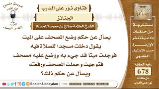 وهذا سائل يسأل عن حكم وضع المصحف على الميت. يقول دخلت مسجدا آآ للصلاة فيه فوجدت ميتا قد جيء به ووضع عليه مصحف فتوجهت وحملت المصحف ورفعته ويسأل عن حكم ذلك. قد احسنت فيما صنعت - 00:00:00ضَ