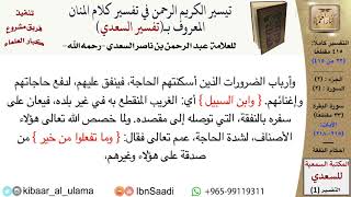 وهم اهل الحاجات وارباب الضرورات. الذين اسكنتهم الحاجة فينفق عليهم لدفع حاجاتهم واغنائهم. وابن السبيل للغريب المنقطع به في غير بلده. فيعان على سفره بالنفقة التي توصله الى مقصده. ولما خصص الله تعالى هؤلاء الاصناف لشدة الحاجة - 00:01:10ضَ