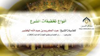 وتخفيف تأخير كالجمع جمع التأخير وتأخير صيام رمضان للسفر والمرض تخفيف ترخيص كصلاة المستجمر وشرب الخمر للغصة وتخفيف وتغيير كتغيير صلاة الخوف. هذه انواع التخفيف في الشرع - 00:00:34ضَ