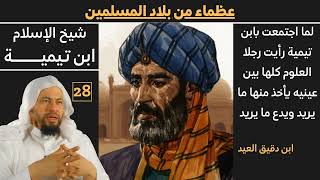 دقيق العيد اماما كبيرا عظيما. يقول عن ابن تيمية يقول ما ظننت ان الله تعالى بقي يخلق مثلك ويقول آآ الحافظ الكبير المزي يقول لا والله لا رأيت مثله ولا رأى هو مثل نفسه - 00:06:50ضَ