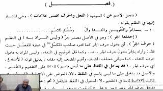 بسم الله الرحمن الرحيم الحمد لله رب العالمين والصلاة والسلام على سيد الخلق سيدنا محمد وعلى اله واصحابه اجمعين. الان نقرأ ما قاله وابنه هشام نعم سيبدأ الان بعلامات الاسم قال فصل يتميز يتميز الاسم عن الفعل والحرف بخمس علامات احداها - 00:00:00ضَ
