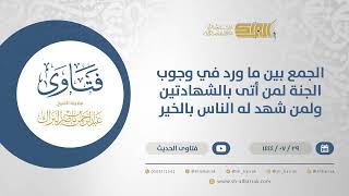 فكيف الجمع بين الحديثين الاول من قال لا اله الا الله هذا وجوب وجوب عام والثاني للمعين مثل ما الرسول في في الجنازة التي مر بها فقال وجبت وقال ثم قال انتم شهداء الله في ارضه - 00:00:20ضَ