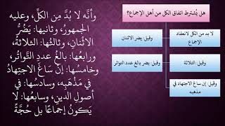 وانه لا بد من الكل وعليه الجمهور وثانيها يضر الاثنان وثالثها الثلاثة ورابعها بالغ عدد التواتر وخامسها ان صاغ الاجتهاد في مذهبه وسادسها في اصول الدين وسابعها لا يكون اجماعا بل حجة. نعم. هذه مسألة اخرى وانه يعني وعلم من التعريف انه - 00:00:00ضَ