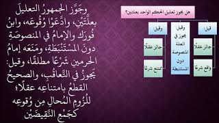 يوصف حكمه هذا الان في هذه الصورة وهذه الحالة ويعلل باكثر من علة يجوز الجمهور بعلتين وادعوا وقوعه. ابن فورك والامام قالوا يجوز في المنصوصة دون المستنبطة العلل المنصوصة يجوز ان تجتمع علتان على معلول واحد اما المستنبطة فلا. منعه امام الحرمين شرعا مطلقا. امام الحرمين - 00:02:53ضَ