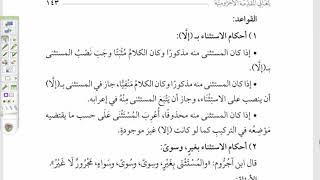 قواعد احكام الاستثناء الا اذا كان المستثنى منه مذكورا وكان الكلام مثبتا وجب نصب المستثنى بالا. اذا كان منه مذكورا وكان الكلام منفيا جاز في المستثنى به الا ان ينصب على الاستثناء وجاز ان يتبع المستثنى منه في الاعراب. على انه - 00:11:40ضَ