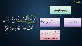 ازالة المانع من وصوله وهكذا الخارج من سبيله والفرد غسل الوجه واليدين مسح لرأس غسل كالرجلين والفم والانف من الوجه اجعلها والاذن من رأسك ترتيب الى واجبه هذا اللي معانا الان واجبه تسمية مع غسل كفين من قيام نوم ليلي واجب - 00:02:04ضَ