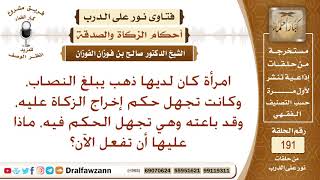 امرأة كان لديها ذهب يبلغ النصاب وكانت تجهل حكم اخراج الزكاة عليه. وقد باعته وهي تجهل الحكم ثم في ماذا عليها ان تفعل الان؟ لا حرج عليها في ذلك لان اه زكاة الحلي الذي يستعمل فيها خلاف بين العلماء الجمهور - 00:00:00ضَ