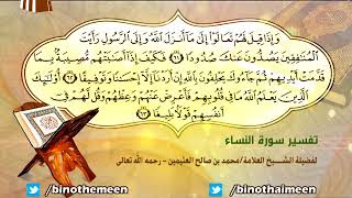 ويحتمل ان تكون للعموم لكن كونها للرسول اقرب الى السياق واذا رأيت المنافقين يصدون عنك صدودا المنافقين المنافقين اسم فاعل من نافق وهو مأخوذ من نافقاء الياربوع اي جحره وجحر الربوع مبني على الخداع - 00:04:42ضَ