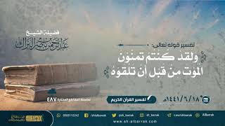 يقول تعالى ولقد كنتم ايها المؤمنون يتمنون الموت من قبل ان تلقوه وذلك بتمني لقاء العدو وقد نهى النبي صلى الله عليه وسلم انت تمني لاقراء العدو لا تتمنوا لقاء العدو واسألوا الله العافية - 00:00:00ضَ
