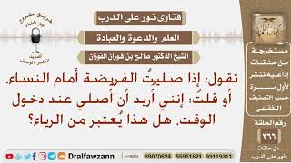 تقول: إذا صليت الفريضة أمام النساء، أو قلت: إنني أريد أن أصلي عند دخول الوقت هل هذا يعتبر من الرياء؟