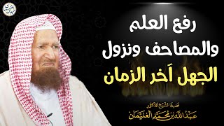 هذا الذي اخبر به الرسول صلى الله عليه وسلم ان هذا رفع العلم العلم رفعه بامرين. احدهما بموت العلماء يا ماتوا ما صار بعدهم من كان مثله ثم بعد ذلك يتخذ الناس رؤساء جهال - 00:01:26ضَ