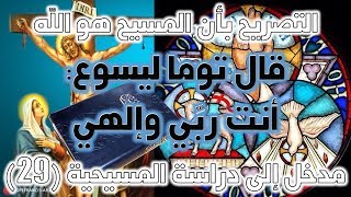 واراهم يديه وجنبه ولكن طوما لم يكن موجودا. وبعد ثمانية ايام ظهر المسيح لتلاميذه وكان توما معهم فقال لتوما الاقوال المذكورة في الانجيل فاجاب توما ربي والهي والمسيحيون يفهمون ان هذه الاجابة تعني ان توم امن بان المسيح ربه واله. الان ننتقل الى التفاصيل الموجودة في - 00:13:34ضَ