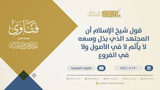 احسن الله اليكم. يقول السائل نقل عن شيخ الاسلام انه يرى ان المجتهد الذي بذل وسعه في طلب الحق لا يأثم لا في الاصول ولا في الفروع. فما معنى ذلك - 00:00:00ضَ