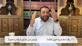 رقت مضاربه فهن كأنما يبدين من عشق الرقاب نحولا. ثم قال في البيت السابع عشر امعفر الليث الهزبر بصوته؟ لمن ادخرت الصالب المسخ المعفرة دي همزة جديدة يعني يا معفر هنا يخاطب طبعا بدر ابن عمار يا من عفرت الليث الهزبر بصوتك. طبعا هذا البيت اللي - 00:12:50ضَ